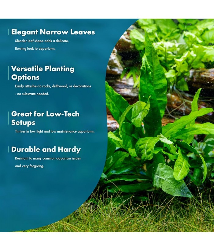 - Narrow Leaf Java Fern features long, slim, deep green fronds—ideal for adding height and motion to the midground or background of freshwater aquascapes.