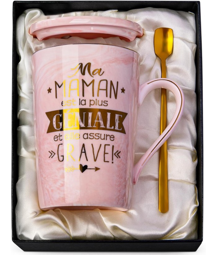 Mom Christmas Birthday Gift - My Mom Is the Most Awesome - Coffee Mug with Gold Inscription, Gift Box Idea for Mom, 400ml Ceramic Mother Mug, Lid, Spoon, Greeting Card