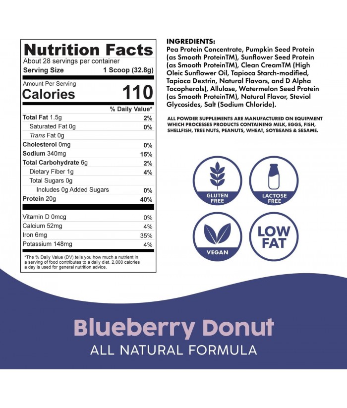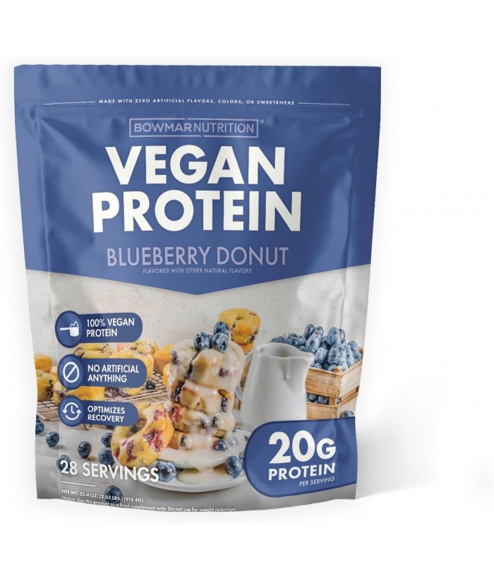 BOWMAR NUTRITION Vegan Protein, Vegan Gluten Free Protein Powder, 20-22g of Protein, Low Fat, Delicious Tasting. Pea, Pumpkin Seed, Watermelon Seed, & Sunflower Seed Protein (Blueberry Donut)