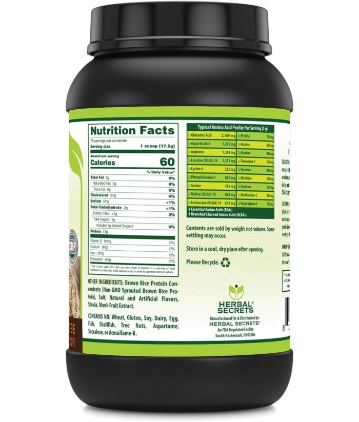 Herbal Secrets Brown Rice Protein Supplement | 3 Lb Powder | 12 Grams Protein per Serving | Vegan | Made in USA (3 Lb, Coffee)