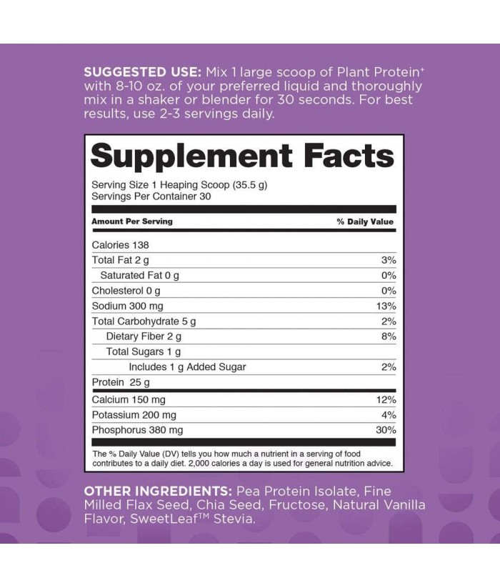 25G PURE PEA PROTEIN: Vegan, Non-GMO, Gluten-free. 25g per serving of pea protein isolate from North American Yellow Peas.